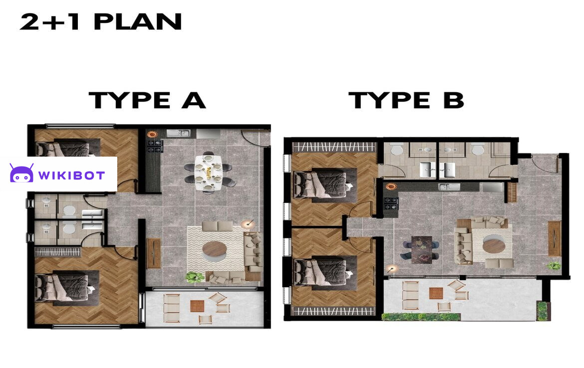 Так же есть квартиры 2+1 планировкой ЛОФТ, общей площадью 170 м2, крытой площадью 90 м2 балконом 18 м2 и террасой на крыше 62 м2. Оплата возможна в беспроцентную рассрочку с 35% первоначальным взносом и 65% рассрочкой до 2028 года.